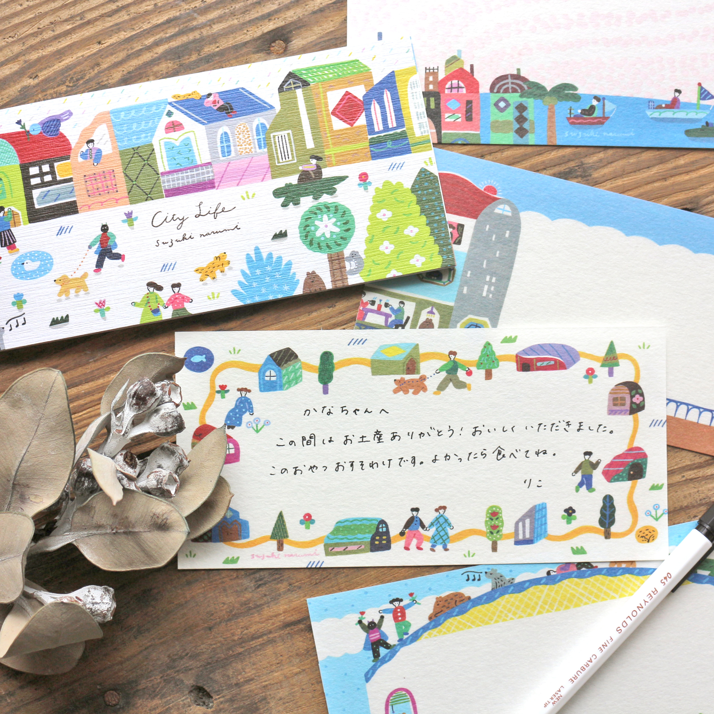 俯瞰の構図でカラフルに、人々や生き物の振る舞いをかわいらしく描くことが好きです。